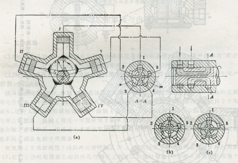 隨著曲軸的旋轉(zhuǎn),配流軸也跟著旋轉(zhuǎn),從而使各柱塞缸與配流軸上配流窗口m和n的相對位置即配流狀態(tài)發(fā)生變化。當(dāng)曲軸在0~90°范圍內(nèi)轉(zhuǎn)動時,柱塞缸I由過渡狀態(tài)接通壓力油,隨后柱塞缸II也由回油狀態(tài)接通壓力油。而與此相反,柱塞缸IV則由接通壓力油換成接通回油(圖2-6右下角所示的曲軸轉(zhuǎn)過90°時配流狀態(tài))。此時曲軸輸出的扭矩與圖2-6所示配管連接的原始位置相比,變?yōu)橛蒊、II、V三個柱塞缸產(chǎn)生的扭矩之和,但扭矩方向仍未改變。當(dāng)曲軸由90°繼續(xù)轉(zhuǎn)到180°時,I缸又重新處于封閉過渡狀態(tài),而柱塞缸II、III都已換成與壓力油相通,柱塞缸IV、V則換成與回油相通,曲軸上的扭矩又變成由兩個柱塞缸產(chǎn)生的扭矩之和。當(dāng)曲軸轉(zhuǎn)過180°時,柱塞缸工作腔與壓力油和回油換接一次,扭矩方向仍未改變。當(dāng)曲軸由180°轉(zhuǎn)到360°時,各柱塞缸又發(fā)生相反的轉(zhuǎn)換,又回到圖2-6所示配管連接狀態(tài),重復(fù)以上過程。