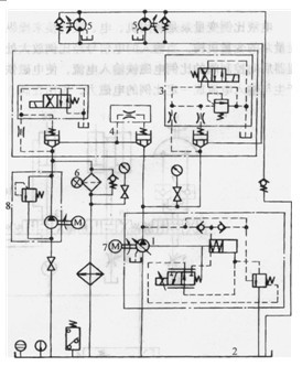 系統(tǒng)流量由電液比例變量泵1來調(diào)節(jié)。壓力由溢流閥3調(diào)節(jié)。由于系統(tǒng)流量大,所有元件均采用錐閥形式。