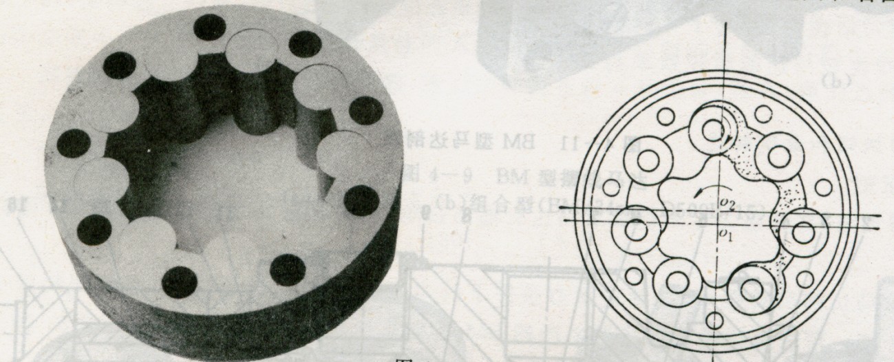 BM型液壓馬達的內(nèi)部剖視和裝配構造分別如圖2和圖3所示。它由輸出(配流)軸1、殼體5、配流套7、行星轉子齒輪15、定子滾柱13、雙端鼓形花鍵軸8等組成。螺釘18將輔助配流板12、齒圈體14、后蓋板16緊固在馬達殼體5上,齒圈體14上制有銷柱式針輪13,厚度尺寸比齒圈體略小0. 03~0.05mm的轉子行星齒輪15在齒圈內(nèi)與針輪共軛嚙合并形成z2個密封容腔。其配流通道、原理和過程與圖4所示完全一樣。此處不再重復。