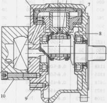 過(guò)曲軸球面軸承套5的中心,因此,柱塞2在往復(fù)運(yùn)動(dòng)中對(duì)缸體1不產(chǎn)生側(cè)向力,高壓油從通油盤(pán)10的進(jìn)油口進(jìn)入與曲軸一起旋轉(zhuǎn)的配流盤(pán)11,并經(jīng)后殼體9中的流道和耳軸套4上的油道進(jìn)入柱塞2上