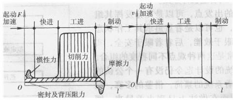 對液壓系統(tǒng)進(jìn)行工況分析,就是要查日爿它的每個(gè)執(zhí)行元件在各自工作過程中的運(yùn)動速度和負(fù)載的變化規(guī)律,這是滿足主機(jī)規(guī)定的動作要求和承載能力所必需具備的。液壓系統(tǒng)承受的負(fù)載可由主機(jī)的規(guī)格規(guī)定,可由樣機(jī)通過實(shí)驗(yàn)測定,也可以由理論分析確定。當(dāng)用理論分析確定系統(tǒng)的實(shí)際負(fù)載時(shí),必須仔細(xì)考慮它所有的組成項(xiàng)目,例如:工作負(fù)載(切削力、擠壓力、彈性塑性變形抗力、重力等)、慣性負(fù)載和阻力負(fù)載(摩擦力、背壓力)等,并把它們繪制成圖,如圖11-2a所示。同樣地,液壓執(zhí)行元件在各動作階段內(nèi)的運(yùn)動速度也須相應(yīng)地繪制成圖,如圖11-2b所示。設(shè)計(jì)簡單的液壓系統(tǒng)時(shí),這兩種圖可以省略不畫。
