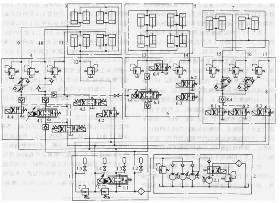 圖2為板帶軋鋼機(jī)彎輥及平衡裝置液壓系統(tǒng)圖。由于軋機(jī)在不同操作狀態(tài)時(shí)需要不同的油壓,經(jīng)過管1.2供給彎輥的壓力為24MPa,經(jīng)過管1.3供給平衡缸的壓力為18MPa;經(jīng)過管14供給換輥所需油壓為6MPa;經(jīng)過管1.5供給液壓缸的背壓為0.5MPa。分級調(diào)壓油路單元1可以提供這四種油壓,其中電液伺服壓力閥1.1對18MPa級的壓力可進(jìn)行控制。2為油源單元,四臺液壓泵中的泵2.1可以作為油箱內(nèi)部凈化循環(huán)用。3為正彎輥(也可作工作輥平衡)液壓缸組,每個(gè)工作輥在一側(cè)機(jī)架上有兩個(gè)正彎輥液壓缸,總計(jì)有8個(gè)。上工作輥正彎輥液壓缸的無桿腔引出兩條油路9、10;下工作輥四個(gè)正彎輥液壓缸的無桿腔共同引出一條油路11;八個(gè)正彎輥液壓缸的有桿腔共同引出一條油路12。正彎輥控制油路單元4對正彎輥液壓缸組3進(jìn)行控制,其所有的閥處于相應(yīng)的工作狀態(tài)時(shí)可以完成下述工作要求:①正彎輥上作時(shí),油路12通過4.2接通0.5MPa油壓,形成液壓缸的背壓;油路9、10、11并聯(lián),通過電液伺服壓力閥4.1接通24MPa油源,根據(jù)正彎輥的電信號對電液伺服壓力閥的輸出壓力進(jìn)行控制,從而控制正彎輥的彎輥力;②上、下正彎輥同時(shí)進(jìn)入平衡狀態(tài)工作時(shí),油路12仍接通0.5 MPa油壓,油路9、10、11并聯(lián)通過閥4.3接通18MPa油壓,平衡壓力由電液伺服壓力閥1.1進(jìn)行控制。只要求上工作輥進(jìn)人平衡工作狀態(tài)時(shí),則油路9、10并聯(lián),通過閥4.4接通18MPa油壓;③換輥工作狀態(tài)時(shí),油路9、10、Il并聯(lián)通過閥4.4接通油箱,油路12通過閥4.2接通6MPa油壓,使八個(gè)止彎輥液壓缸的活塞桿全部縮回;④穿帶工作狀態(tài)時(shí),油路12通過閥4.2接通0.5MPa油壓,油路9、10、11并聯(lián),同時(shí)與輸出壓力調(diào)定在0.5MPa的電液伺服壓力閥4 1接通。5為負(fù)彎輥液壓缸組,八個(gè)液壓缸的無桿腔和有桿腔分別并聯(lián)出二條油路13、14,由負(fù)彎輥控制油路單元6來控制,其所有閥處于相應(yīng)的工作狀態(tài)時(shí),可以完成下述工作要求:①負(fù)彎輥工作時(shí),油路14通過閥6.2、6.3接通0.5MPa油壓,形成液壓缸的背壓,油路13通過電液伺服壓力閥6.1接通24MPa油壓,根據(jù)負(fù)彎輥的電信號對輸出壓力進(jìn)行控制,從而控制負(fù)彎輥力的大?。虎趽Q輥時(shí),油路l3通過閥6.4接通油箱,油路14通過閥6.2、6.3接通6MPa油壓,使八個(gè)負(fù)彎輥液壓缸的活塞桿全部縮回;③穿帶時(shí),油路14通過閥6.2、6.3接通0.5MPa油壓,油路13與輸出壓力調(diào)定為0.5MPa的電液伺服壓力閥6.1接通。7為支承輥平衡液壓缸組,四個(gè)液壓缸由平衡油路單元8控制,其所有閥處于相應(yīng)的工作狀態(tài)時(shí),可以完成下述工作要求:①平衡時(shí),15、16油路通過閥8.4、8.1接通18MPa油壓,油路17通過閥8.3接通0.5MPa油壓,閥8.2控制液控單向閥8.4可使支承輥鎖緊在任何位置上;②換輥時(shí),管經(jīng)15、16通過閥8.4、8.1接通油箱,油路17通過閥8.3接通6MPa油壓,使支承輥液壓缸的活塞桿縮回。