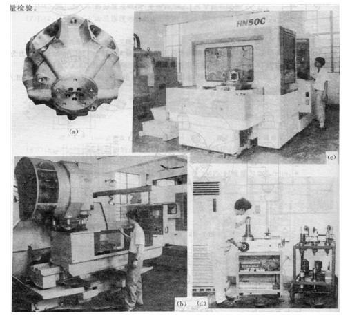 (a)鑄件外觀 (b)數(shù)控加工 (c)進(jìn)口加工中心對殼體進(jìn)行鏜削 (d)產(chǎn)品零件檢驗(yàn)
