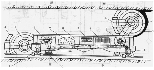 現(xiàn)代綜合機(jī)械化長(zhǎng)壁采煤工作面上大都采用滾筒式采煤機(jī)采煤。其外形結(jié)構(gòu)如圖4.8-4所示。圖中,3為搖臂,4為擋煤板,5為切割部減速箱,6為電動(dòng)機(jī),7為控制箱,8為液壓牽引部,10為調(diào)高液壓缸,11為調(diào)料液壓缸。在割煤滾筒1的螺旋形葉片上裝有截齒,當(dāng)滾筒在煤壁內(nèi)旋轉(zhuǎn)時(shí),便可將煤切下,并裝入工作面刮板輸送機(jī)2的溜槽中運(yùn)走。采煤機(jī)騎在輸送機(jī)的槽幫上。沿工作面全長(zhǎng)有一條張緊的牽引錨鏈,它與采煤機(jī)牽引部的牽引鏈輪9相嚙合,鏈輪轉(zhuǎn)動(dòng),就牽引著采煤機(jī)沿煤壁往復(fù)運(yùn)動(dòng),連續(xù)采煤。