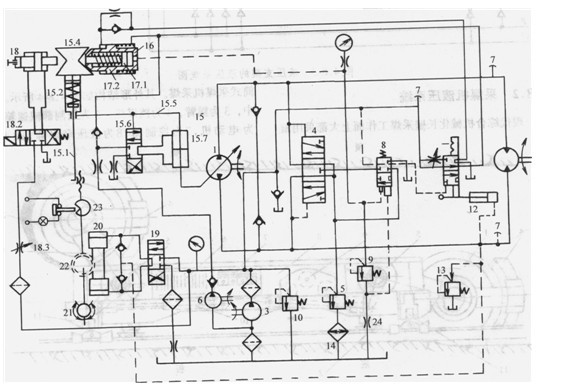 采煤機(jī)的液壓系統(tǒng)見(jiàn)圖4.8-5。主泵1為具有恒功率變量機(jī)構(gòu)的斜軸式軸向柱塞泵,馬達(dá)2為與主泵同規(guī)格的斜軸式定量柱塞馬達(dá)。