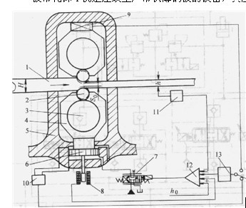 板坯料從旋轉(zhuǎn)著的上、下工作輥2所形成的輥縫中連續(xù)穿過,在軋制力的作用下板帶被軋薄,經(jīng)多道次軋制后可達(dá)到所需成品的厚度。為了軋制薄板帶,工作輥2(與板帶直接接觸的軋輥)的直徑必須減小,但軋制力將使工作輥彎曲變形,為此,在工作輥上下兩側(cè)裝有大直徑的支承輥3以阻止工作輥變形。在軋制過程中對軋輥施以軋制力的機(jī)構(gòu)稱為壓下裝置。被軋板帶l從上、下工作輥2所形成的初始輥縫中穿過。上、下兩組工作輥和支承輥3支持在上、下軸承座4上。上、下軸承座裝在前、后兩側(cè)機(jī)架5內(nèi)(圖示為移去前側(cè)機(jī)架后的示意圖),上軸承座壓在測壓頭9上,下軸承座的位置由壓下液壓缸6控制。假如軋機(jī)的機(jī)架、軋輥、軸承座等傳力系統(tǒng)都是絕對剛體,那么由壓下液壓缸調(diào)定的初始輥縫值Su也就是軋制成品的厚度h。實際上由于被軋鋼板有很大的塑性變形,軋機(jī)傳力系統(tǒng)都是彈性體,因此,在初始輥縫給定條件下,板帶一經(jīng)穿入,整個傳力的彈性系統(tǒng)就會變形使輥縫變大,成品厚度h也變大。此外,在軋制過程中由于板帶坯料厚度和材料變形抗力的變化以及傳力系統(tǒng)幾何形狀的變化(如軋輥的偏心)等因素的影響,也會使板帶成品厚度發(fā)生變化。為了軋制出等厚度的板帶,壓下液壓缸不僅應(yīng)能調(diào)節(jié)空載時初始輥縫的大小,而且在軋制過程中其實際壓下量還必須隨時調(diào)整,以補(bǔ)償軋機(jī)傳力系統(tǒng)的彈性變化量(也稱為軋機(jī)的彈跳)的影響。可見,板帶軋鋼機(jī)的液壓壓下系統(tǒng)是在軋制過程中保證板帶沿縱向能有等厚度的自動控制系統(tǒng)。壓下液壓缸6由電渡伺服閥7進(jìn)行控制,壓下液壓缸的位移(反映初始輥縫的大小)由位移傳感器8檢測。軋機(jī)的彈跳量決定于軋制力的大小,為此在軋機(jī)的l軸承座上裝有測壓頭9,檢測軋制力的變化,考慮軋機(jī)剛度后即可感受出彈跳量的大小?;蛴脡毫鞲衅?/span>10測出壓下液壓缸前后壓差的變化,也可感受出彈跳量的大小。板帶出口的實際厚度h用測厚儀1l檢測。將位移傳感器、測厚儀、測壓頭(或壓力傳感器)經(jīng)過剛度調(diào)節(jié)器13處理后的信號輸入伺服放大器12,其輸出送至電液伺服閥以完成板帶的等厚度控制。其控制方框圖如圖 2所示。測厚儀測得的出口板厚h與板厚給定值ho進(jìn)行比較,產(chǎn)生厚度偏差調(diào)節(jié)量,考慮了在彈性傳力系統(tǒng)中板厚和輥縫之間的關(guān)系(用板厚一輥縫系數(shù)表示)后得到初
