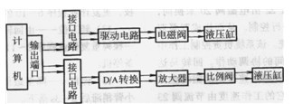 由于林木球果采集作業(yè)對(duì)動(dòng)作精度不高,同時(shí)為了降低生產(chǎn)成本,便于推廣應(yīng)用,故采用開環(huán)控制的計(jì)算機(jī)數(shù)字程序控制系統(tǒng)。其控制參數(shù)有6個(gè)電磁換向閥為12個(gè)開關(guān)量,加2個(gè)電磁溢流閥,共14個(gè)開關(guān)量,2個(gè)電液比例調(diào)速閥為兩個(gè)所示。