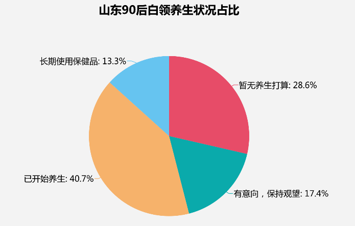 據(jù)統(tǒng)計,現(xiàn)如今中國有一大部分年輕人都開始注重養(yǎng)生,且山東省90后已經(jīng)有過半年輕人開始養(yǎng)生。下圖為山東90后白領(lǐng)養(yǎng)生狀況占比,據(jù)調(diào)查顯示,已有40.7%的白領(lǐng)開始養(yǎng)生;更有13.3%白領(lǐng)表示長期在使用保健品;有17.4%的白領(lǐng)意向養(yǎng)生并持觀望態(tài)度;僅有28.6%的白領(lǐng)表示無養(yǎng)生打算。