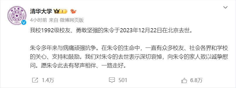 清華大學12月23日發(fā)布消息稱,該校1992級校友朱令于2023年12月22日在北京去世。