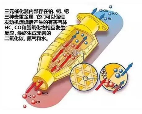 大部分汽車中都有一個配件——三元催化器,它能減少諸如一氧化碳、碳?xì)浠衔锖偷趸衔锏扔泻怏w的排放,是汽車中一個比較重要的組成部分。轉(zhuǎn)換器中的某些化學(xué)反應(yīng)會將有害物質(zhì)轉(zhuǎn)換為二氧化碳、水和氮。