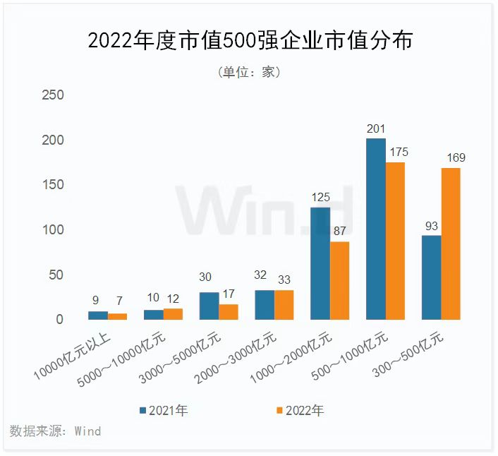 2022年度,500強中共有7家公司市值超1萬億元,數量較去年減少2家,3000-5000億元之間的企業(yè)、1000-2000億元之間的企業(yè)、500-1000億元之間的企業(yè)均有顯著減少,300-500億元之間的企業(yè)明顯增多。2022年度,500強企業(yè)平均市值為1325億元,中位數市值664億元,最低門檻為343億元,均出現回落。完整榜單中,共有76家新面孔躋身500強。