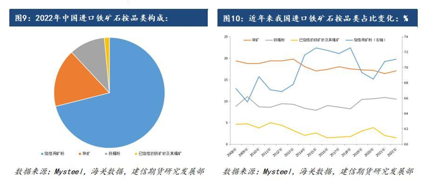 從進(jìn)口品類來看,我國燒結(jié)用粉礦占比最高,2022年占比約為71.0%;塊礦居次,占比約為17.0%;鐵精粉第三,占比約為10.5%;已燒結(jié)的鐵礦砂占比最小僅為1.5%。