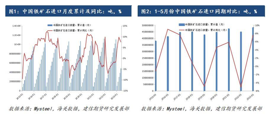 據(jù)我的鋼鐵網(wǎng)數(shù)據(jù)顯示,今年1-5月份中國鐵礦石進(jìn)口量達(dá)到4.8075億噸,同比增長7.7%,從絕對(duì)值數(shù)量上來說,已經(jīng)超過2021年同期的最高值4.7093億噸,再創(chuàng)歷史同期新高。從今年1-5月份進(jìn)口數(shù)據(jù)來看,2023年我國鐵礦石進(jìn)口規(guī)?;蛟俣茸吒撸慌懦龑?chuàng)下歷年鐵礦石進(jìn)口量新高的可能。