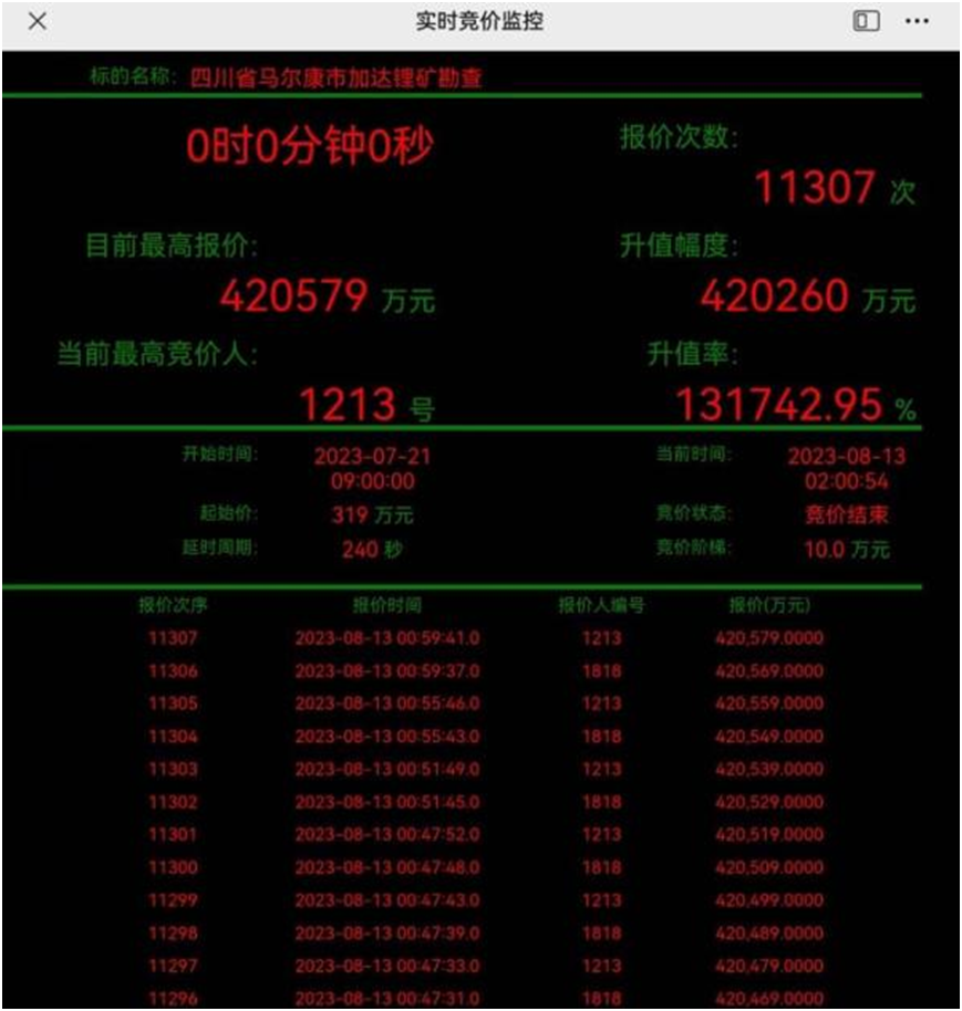 值得注意的是,三天前(8月11日),四川能投資本控股有限公司以10.1億元的價(jià)格拍得四川省金川縣李家溝北鋰礦探礦權(quán)。該筆競價(jià)交易同樣鏖戰(zhàn)2天,報(bào)價(jià)次數(shù)3412次,較57萬元起拍價(jià)升值超1771倍。