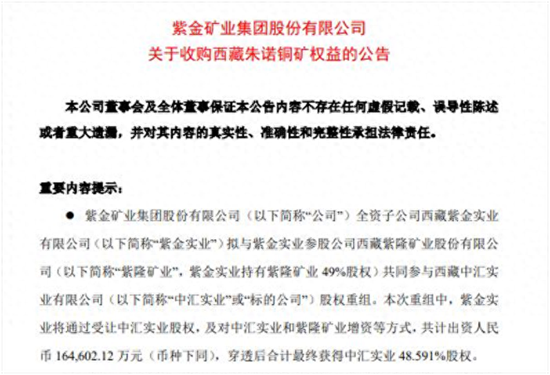 8月21日,紫金礦業(yè)宣布,以16.46億元收購(gòu)中匯實(shí)業(yè)48.591%股權(quán),進(jìn)而獲得國(guó)內(nèi)未開發(fā)超大型銅礦西藏朱諾銅礦的相對(duì)控股權(quán)。根據(jù)協(xié)議,未來(lái),朱諾銅礦的建設(shè)及運(yùn)營(yíng)將由紫金礦業(yè)主導(dǎo)。