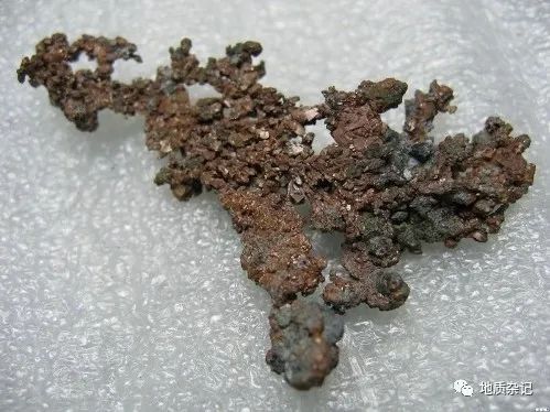 自然銅是地質(zhì)作用中還原條件下的產(chǎn)物,形成于原生熱液礦床;也見于含銅硫化物礦床氧化帶下部,常與赤鐵礦、孔雀石、輝銅礦等伴生,由銅的硫化物還原而成: