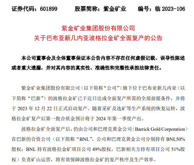 紫金礦業(yè)旗下巴布亞新幾內(nèi)亞波格拉金礦峰回路轉(zhuǎn),迎來(lái)復(fù)產(chǎn)倒計(jì)時(shí)。12月11日,紫金礦業(yè)發(fā)布公告,宣布波格拉金礦已于近日達(dá)成全面復(fù)產(chǎn)所需的全部前提條件,并將于2023年12月22日正式啟動(dòng)復(fù)產(chǎn),預(yù)計(jì)將于2024年第一季度產(chǎn)出第一批合質(zhì)金。