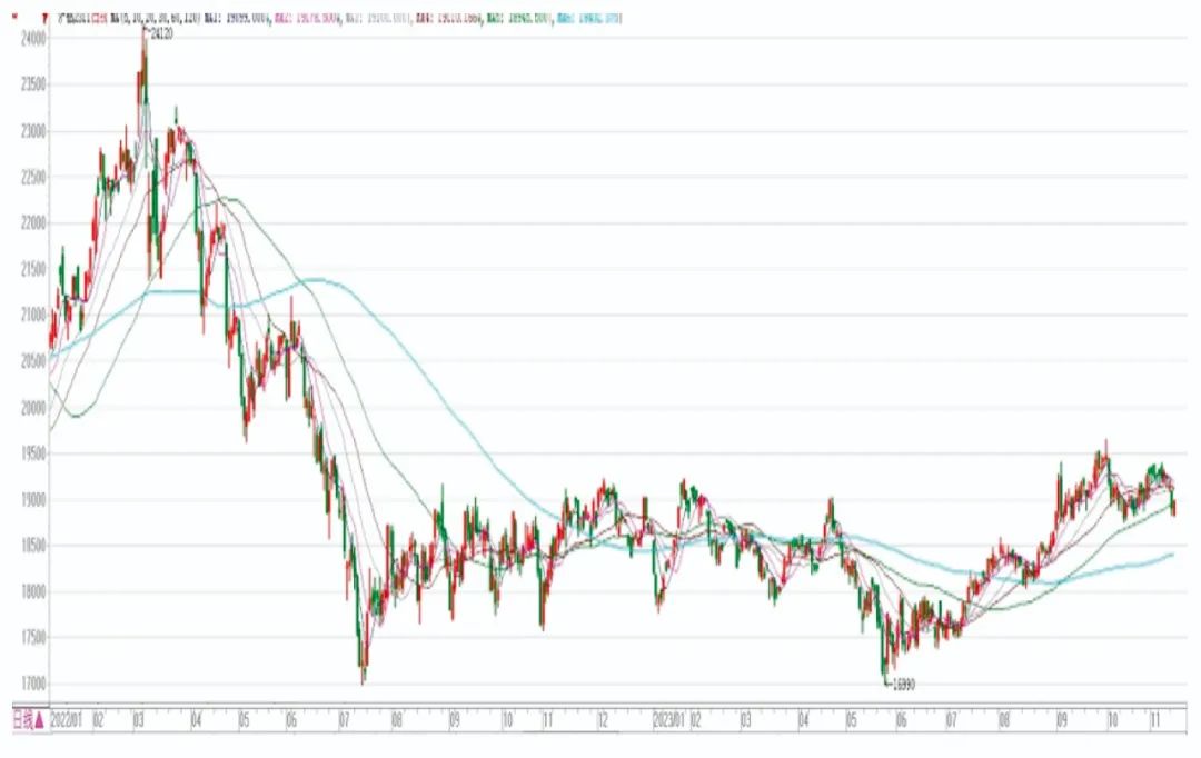 一是鋁價(jià)呈現(xiàn)高位回調(diào)態(tài)勢(shì)。9月下旬鋁價(jià)大幅上漲, 但10月份鋁價(jià)未能延續(xù)上漲態(tài)勢(shì),呈高位回調(diào)的走勢(shì),10月初,由于下游消費(fèi)轉(zhuǎn)弱,鋁呈累庫(kù)狀態(tài),因此節(jié)后鋁價(jià)走勢(shì)連續(xù)低迷,10月中旬,云南地區(qū)由于枯水季,部分電解鋁企業(yè)減產(chǎn),加之宏觀政策面有偏利好消息的支撐,使得鋁價(jià)有一定反彈。但是由于下游消費(fèi)連續(xù)低迷,后續(xù)鋁價(jià)上行壓力仍較大。10月份滬鋁主力合約價(jià)格處于18741元/噸~19252元/噸之間,均價(jià)為18996元/噸,環(huán)比上升304元/噸,漲幅1.6%,同比上升767元/噸,漲幅4.2%。滬鋁主力合約價(jià)格走勢(shì)情況見圖4。