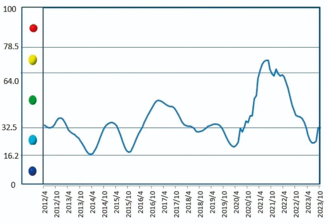 2023年10月份,中國(guó)鋁冶煉產(chǎn)業(yè)景氣指數(shù)為32.6,較上月上升1.3個(gè)點(diǎn),處于“正?!眳^(qū)間下部。中國(guó)鋁冶煉產(chǎn)業(yè)月度景氣指數(shù)走勢(shì)見圖1。