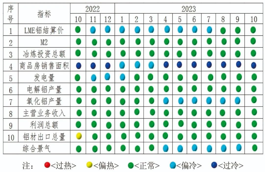 由中國(guó)鋁冶煉產(chǎn)業(yè)景氣信號(hào)燈(見圖2)可見,2023年10月份,在構(gòu)成產(chǎn)業(yè)景氣指數(shù)的10個(gè)指標(biāo)中,LME鋁結(jié)算價(jià)、M2、發(fā)電量、電解鋁產(chǎn)量、鋁冶煉投資總額、氧化鋁產(chǎn)量、主營(yíng)業(yè)務(wù)收入、鋁材出口總量和利潤(rùn)總額等9項(xiàng)指標(biāo)均處于“正?!眳^(qū)間;商品房銷售面積處于“過冷”區(qū)間。