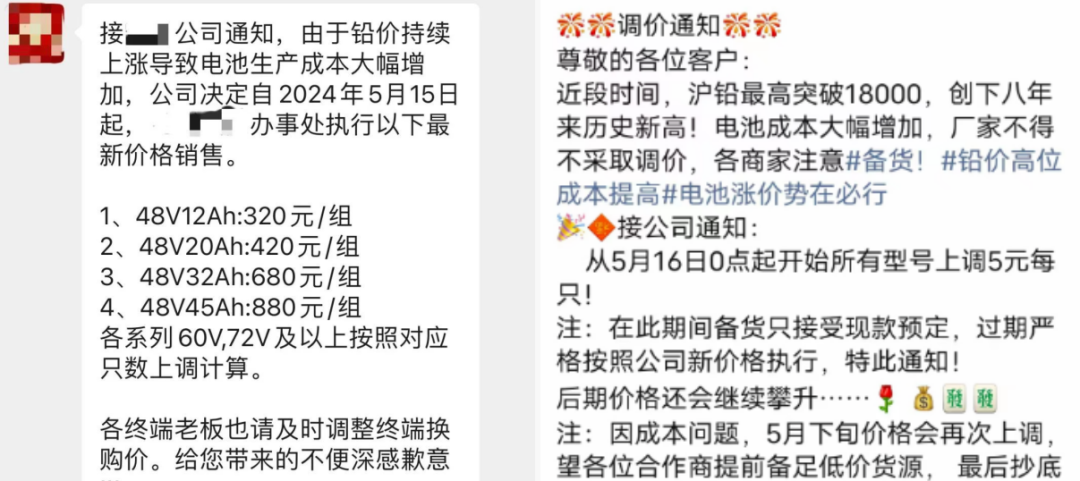 某電池品牌表示,從2024年5月15日起,48/12按照320元/組、48/20按照420元/組、48/32按照680元/組、48/45按照880元/組的價格執(zhí)行,各系列60V、72V及以上按照對應只數(shù)上調計算;另有企業(yè)表示,5月16日開始,所有型號電池上調5元/只,另外由于成本因素,5月下旬價格會再次上調,建議電動車行業(yè)商家合理安排庫存。