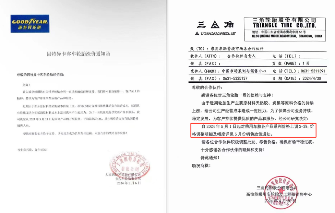 2月以來,已有76家輪胎公司發(fā)布了92份漲價通知。僅在5月就有多家知名企業(yè)宣布產(chǎn)品漲價,漲幅約3%左右。大連固特異輪胎漲幅3%,三角輪胎對乘用車胎各產(chǎn)品系列價格上調2-3%,上海優(yōu)科豪馬輪胎對乘用車輪胎產(chǎn)品調漲3%~6%,建泰橡膠(深圳)對建大集團大陸市場PCR輪胎的替換市場價格上調3%-5%,瑪吉斯輪胎對瑪吉斯乘用車胎調漲2%。