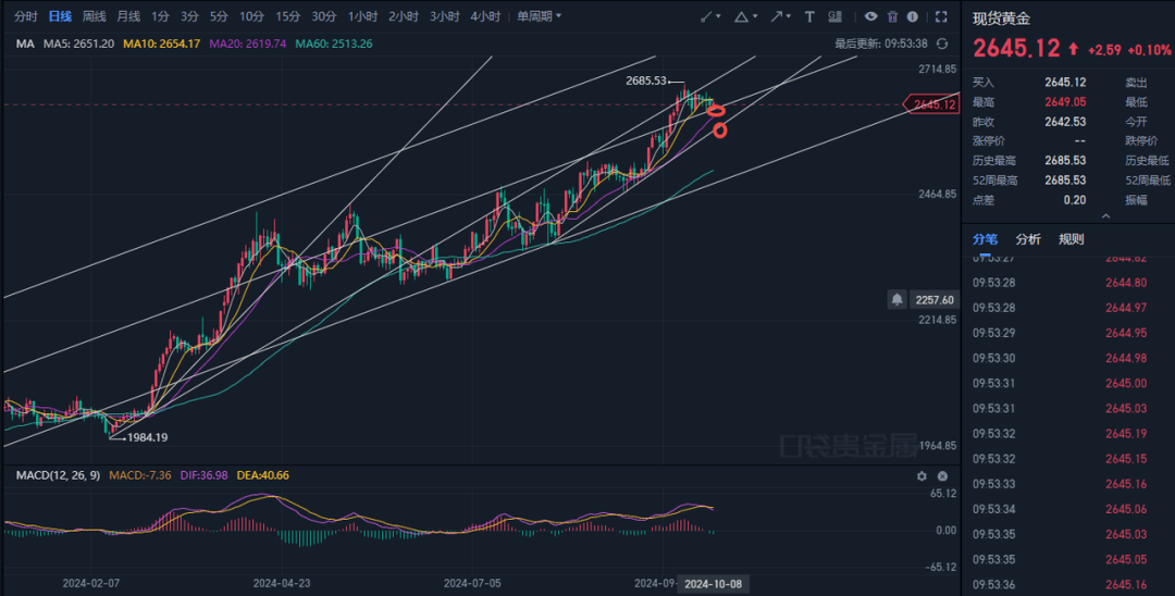 行情回顧:近期就業(yè)數(shù)據(jù)靚麗,投資者降低了對美聯(lián)儲11月大幅降息的預(yù)期,美元保持強(qiáng)勢,美債收益率時隔兩個月首次升破4%,令金價承壓?,F(xiàn)貨黃金延續(xù)回調(diào),錄得日線四連陰,盤中最低觸及2637.71美元/盎司,最終收跌0.40%,報2642.63美元/盎司,市場對美聯(lián)儲降息幅度的預(yù)期減少。