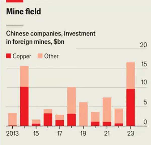 在具體礦產(chǎn)投資上,中國(guó)公司也非常具有戰(zhàn)略性。《經(jīng)濟(jì)學(xué)人》稱,隨著中國(guó)在電池、電動(dòng)汽車和太陽能電池板等產(chǎn)品上越來越具有競(jìng)爭(zhēng)力,中國(guó)對(duì)海外礦業(yè)的投資也越來越多。銅礦是電氣化的重要材料,去年中國(guó)企業(yè)對(duì)這種這礦產(chǎn)的投資約占其海外礦產(chǎn)投資的3/5。