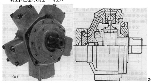 圖1(a)、圖1(b)是寧波產(chǎn)AKS型馬達(dá)的外形和原理示意圖。該馬達(dá)除了端面配流外,它的工作原理、動(dòng)作過程與所有徑向曲軸連桿式單作用大扭矩馬達(dá)相一致。