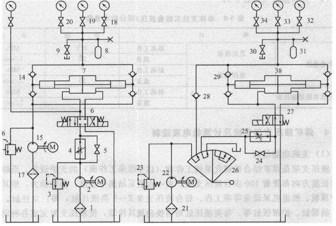 1 5、9、18、19、2024、30、32、33,34-截止閥;6-三位四通電磁換向閥;7、38-增壓器;8、31-蓄能穩(wěn)壓器;10、35-低壓壓力表;11、36-高壓壓力表;12、37一超高壓壓力表;13-油壓壓力表;14、28、29單向閥;26-二位四通手動換向轉(zhuǎn)閥;27-二位四通電磁換向閥