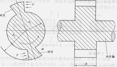 當(dāng)高壓油從薄殼體的進(jìn)油口I進(jìn)入,通過(guò)葉片軸上的斜油孔Ⅱ到達(dá)高壓油腔(A),同時(shí)作用在滾子和葉面上,由于滾子的位置是不變的,因此作用在葉片面上的液壓力推動(dòng)葉片逆時(shí)針 方向旋轉(zhuǎn)。由圖可知,產(chǎn)生的轉(zhuǎn)矩為M=2B(R;-R2)P(設(shè)無(wú)背壓時(shí))。隨著葉片的轉(zhuǎn)動(dòng),A腔容積不斷擴(kuò)大,高壓油連續(xù)不斷地補(bǔ)充進(jìn)來(lái)。而葉片另一側(cè)低壓腔B (T)受到葉片壓縮,容積不斷減小,把低壓油通過(guò)葉片軸上斜孔Ⅲ和出油口Ⅳ流回油箱。