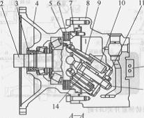 1-制動彈簧;2-驅(qū)動軸;3-隔環(huán);48-殼體;5-摩擦盤;6-摩擦片;7-制動活塞;9-活塞;10 -油缸體;11-配流盤;12-回轉(zhuǎn)晃動防止閥;13-中心軸;14 -中心彈簧;15 -安全閥;16 -單向閥;17 -單向閥彈簧}18-梭閥;19 -梭閥彈簧