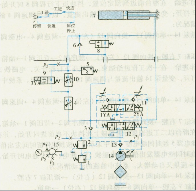 1一背壓閥2-順序閥3、6、13 -單向閥4–工進(jìn)調(diào)速閥5-壓力繼電器7-液壓缸8行程閥9-電磁閥10二工進(jìn)調(diào)遣閥11-先導(dǎo)閥12-換向閥14液壓泵i15-壓力表開關(guān)p1、P2、p3一壓力表接點(diǎn)