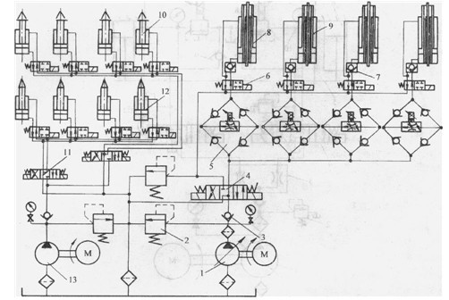 1一主泵2一溢流閥3單向閥4換向閥5液橋6電磁閥7液壓鎖