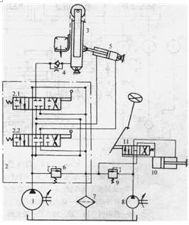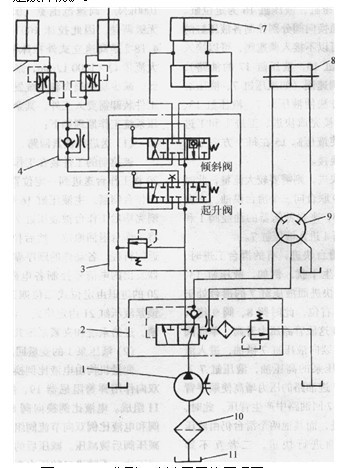 1-操作泵2一控制閥組3-升降液壓缸4單向節(jié)流閥5-傾斜液壓缸6-溢流閥7-回油過濾器8-轉(zhuǎn)向液壓泵9-轉(zhuǎn)向系統(tǒng)溢流閥10-助力液壓缸11轉(zhuǎn)向助力隨動閥