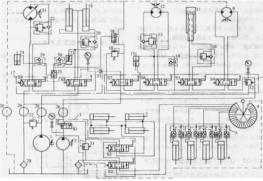 11–支臂伸縮缸12-副吊鉤吊起馬達(dá)14、29、30-單向節(jié)流閥15-副吊鉤制動液壓缸16-液動閥18、27、32、33-溢流閥19-變幅液壓缸21-主吊鉤馬達(dá)