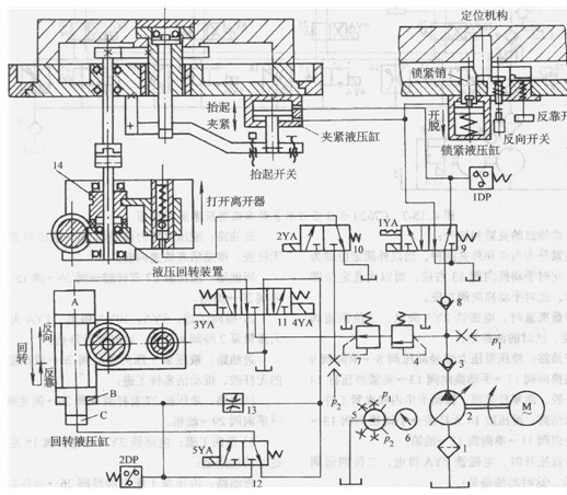 當(dāng)壓力油進(jìn)入夾緊液壓缸上腔,使活塞剛開始向下移動(dòng)時(shí),放開抬起時(shí)壓下的行程開關(guān),使電磁鐵4YA—5YA斷電,2YA通電,換向閥11處于中問位置,換向閥換向。壓力油經(jīng)換向閥10進(jìn)入離合器14的液壓缸,將離合器打開,為回轉(zhuǎn)液壓缸齒條活塞返回做好準(zhǔn)備。