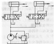 在工程機(jī)械液壓系統(tǒng)中,為了簡化管路,使結(jié)構(gòu)緊湊,常用多路換向閥來達(dá)到系統(tǒng)油路的不同連接方式。圖1.3-5a為并聯(lián)系統(tǒng),b為串聯(lián)系統(tǒng),c為獨(dú)聯(lián)系統(tǒng)。
